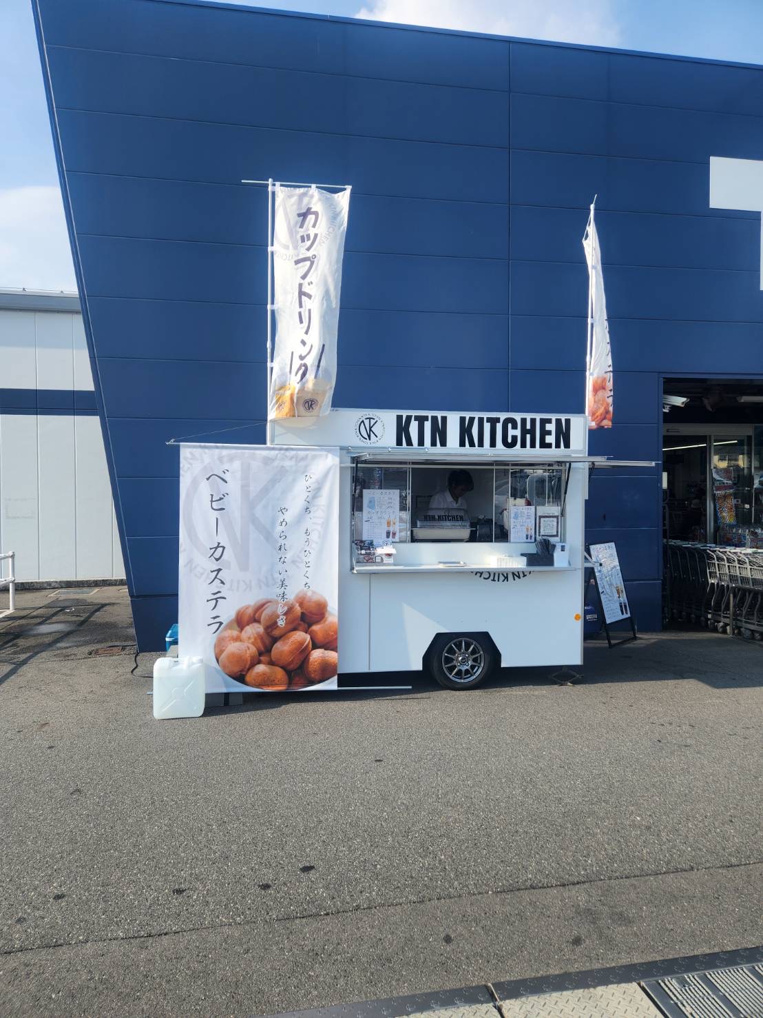 キッチントレーラーでベビーカステラとミックスジュースの販売を行っています。看板商品のベビーカステラは、材料の配合量や焼き加減を何度も研究し、冷めてもふんわりとした食感とやさしい甘さが続くよう仕上げました。時間が経ってもおいしく食べられるため、お土産や差し入れとしても好評です。