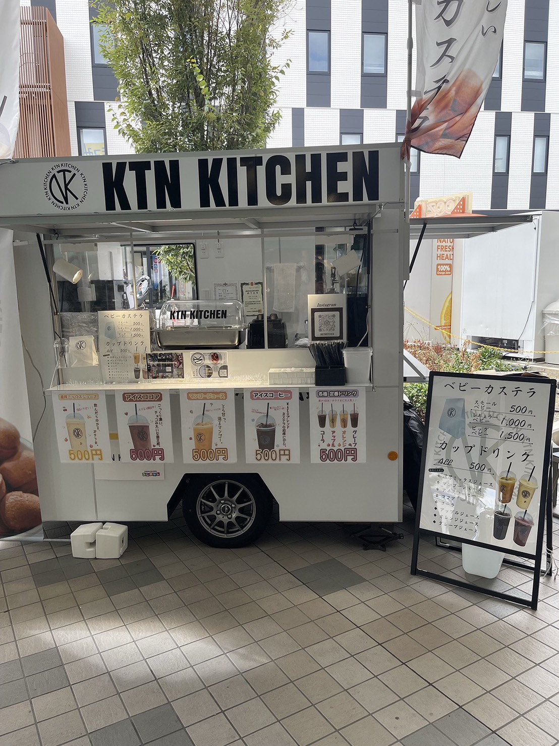 キッチントレーラーでベビーカステラとミックスジュースの販売を行っています。看板商品のベビーカステラは、材料の配合量や焼き加減を何度も研究し、冷めてもふんわりとした食感とやさしい甘さが続くよう仕上げました。時間が経ってもおいしく食べられるため、お土産や差し入れとしても好評です。