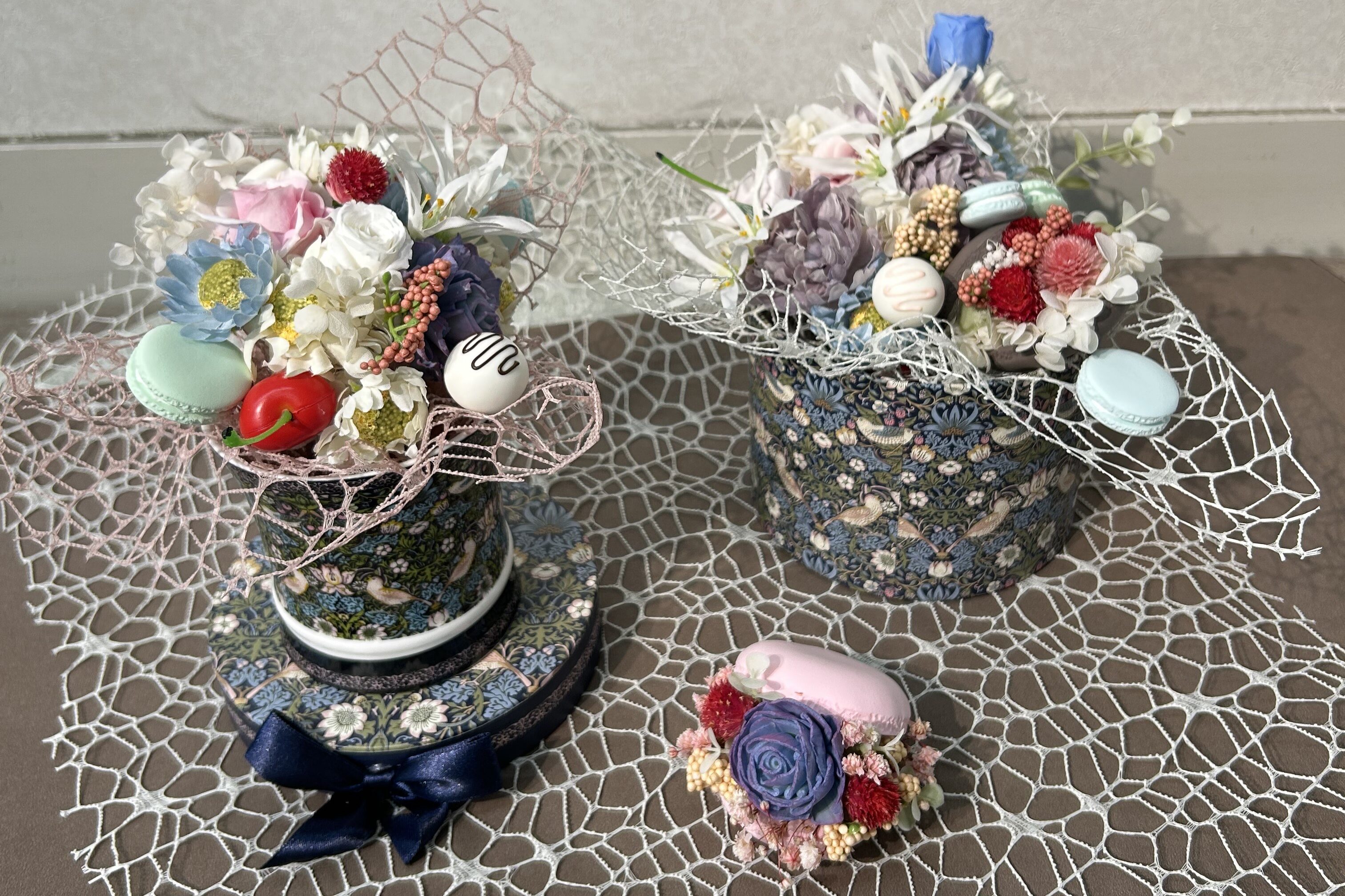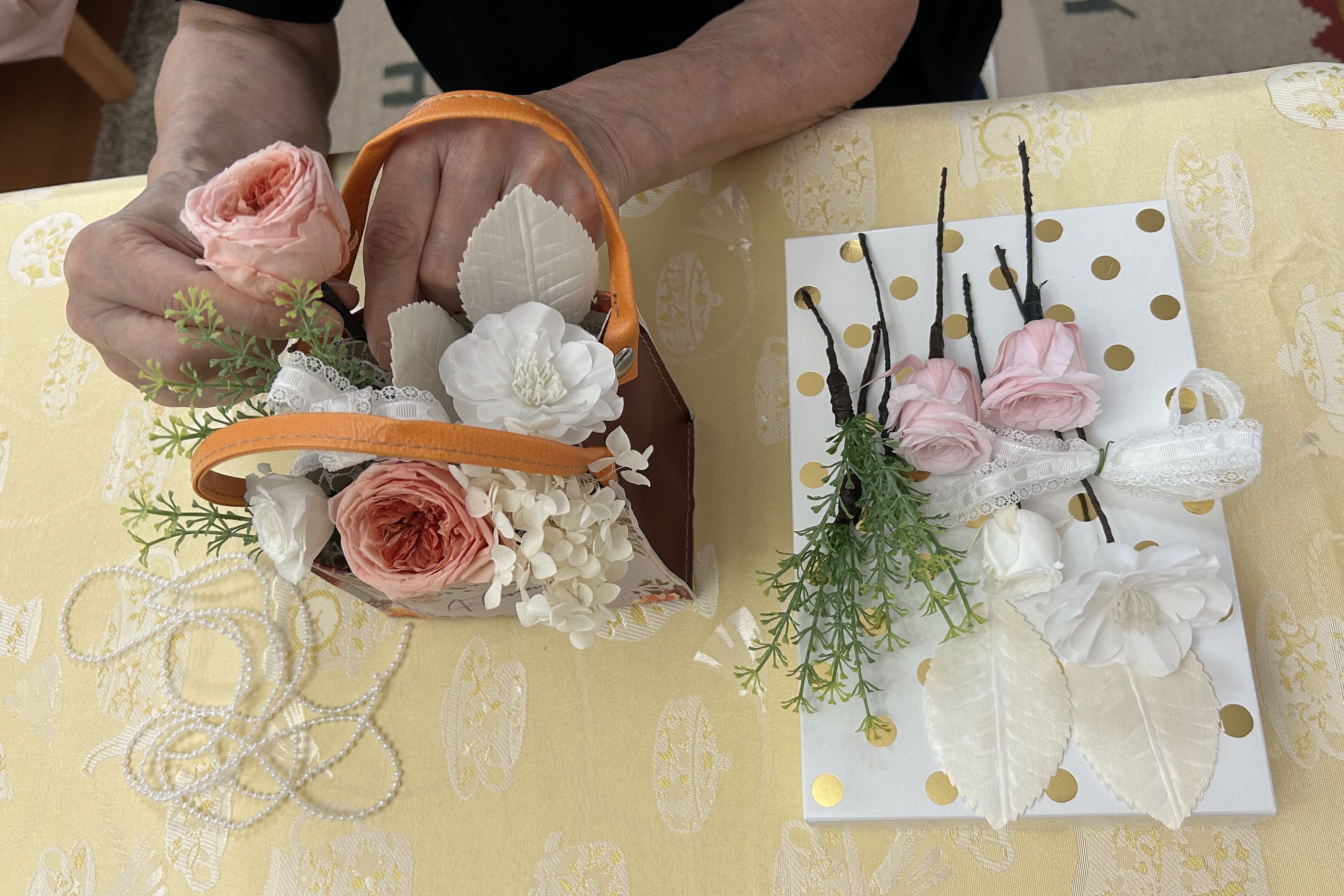 様々な素材を扱うマテリアルフラワーアレンジメントを指導